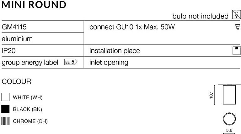Bodové svietidlo vhodné do interiéru vybavené päticou GU10 s maximálnym výkonom 50W. Konštrukcia je vyrobená z hliníka, lakovaná do čiernej farby. Hodnota úrovne krytia je IP20. Svetelný zdroj nie je súčasťou balenia.