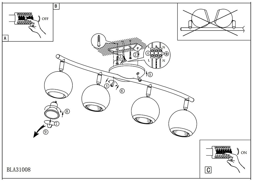 Každý reflektor vám bude svietiť podobne ako 20W halogénová žiarovka. Navyše si otočné reflektory nasmerujete, kam potrebujete. Svietidlo má päticu GU10 a osadíte ju iba LED žiarovkami o maximálnom príkone 3W.