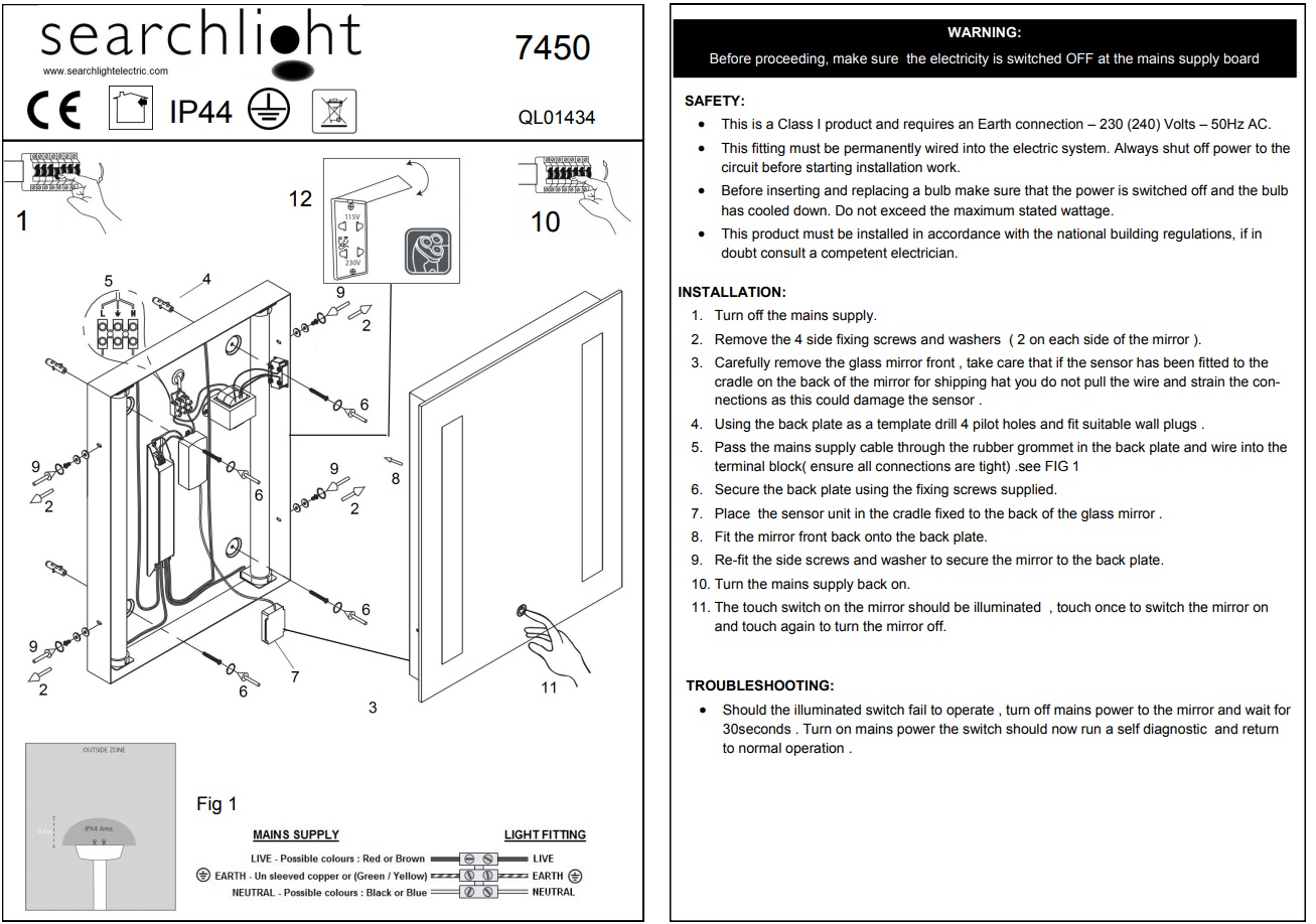 Nástenné zrkadlo radu Bathroom mirrors je vyrobené z kvalitného zrkadlového skla. Zrkadlo má obdĺžnikový tvar a je vhodné do kúpeľní. Veľkou výhodou tohto zrkadla je zásuvka na holiaci strojček. Výrobcom tohto svietidla je anglická spoločnosť Searchlight.