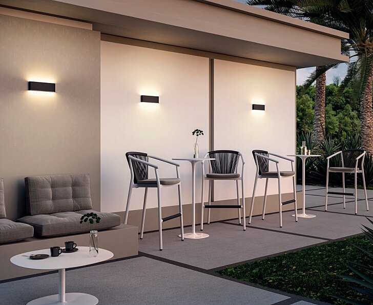 Exteriérové nástenné LED svietidlo vybavené 60 SMD LED diódami o celkovom výkone 2x6W, ktoré vytvára nepriame osvetlenie. Konštrukcia je vyrobená z tlakovo liateho hliníka, elektrostaticky lakovaná do tmavo hnedej farby. Difúzor je vyrobený zo saténového skla. Hodnota CRI je 80, hodnota stupňa krytia je IP54. Svietidlo nie je možné stmievať.