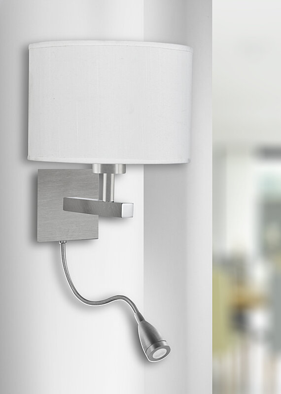 kompatibilný závit (pätica) E27Moderná nástenná lampička je vyrobená z brúseného kovu a textilného tienidla, takže sa ľahko integruje do takmer každého interiéru. Výrobca tohto svietidla je anglická spoločnosť Searchlight. Svietidlo má dva kolískové vypínače - pre každé svetlo zvlášť.
