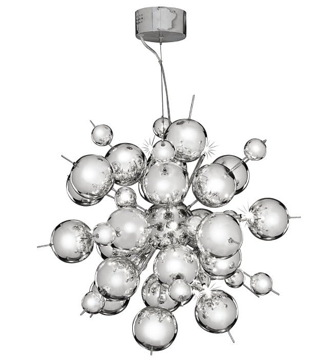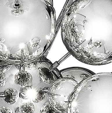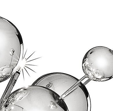 kompatibilný závit (pätica) G4Toto stropné svietidlo radu Molecule má chrómový povrch a tienidlá v tvare gúľ v rôznych veľkostiach. Dvanásť ramien tohto lustra je ovešaný chrómovými guličkami, ktoré vytvára veľkolepý svetelný efekt. Svietidlo má moderný dizajn.
